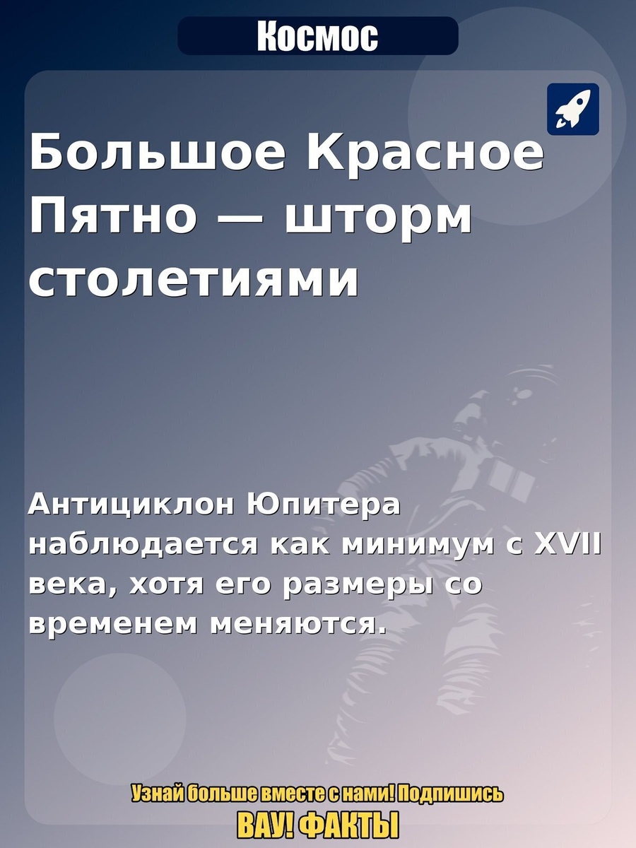 Большое Красное Пятно — шторм столетиями. Антициклон Юпитера наблюдается как минимум с XVII века, хотя его размеры со временем меняются. Интересный факт по теме «Космос»: Большое Красное Пятно — шторм столетиями. Почему так: Антициклон Юпитера наблюдается как минимум с XVII века, хотя его размеры со временем меняются.. Поделитесь в комментариях, знали ли вы об этом и стоит ли делать продолжение по теме. #космос #факты #астрономия