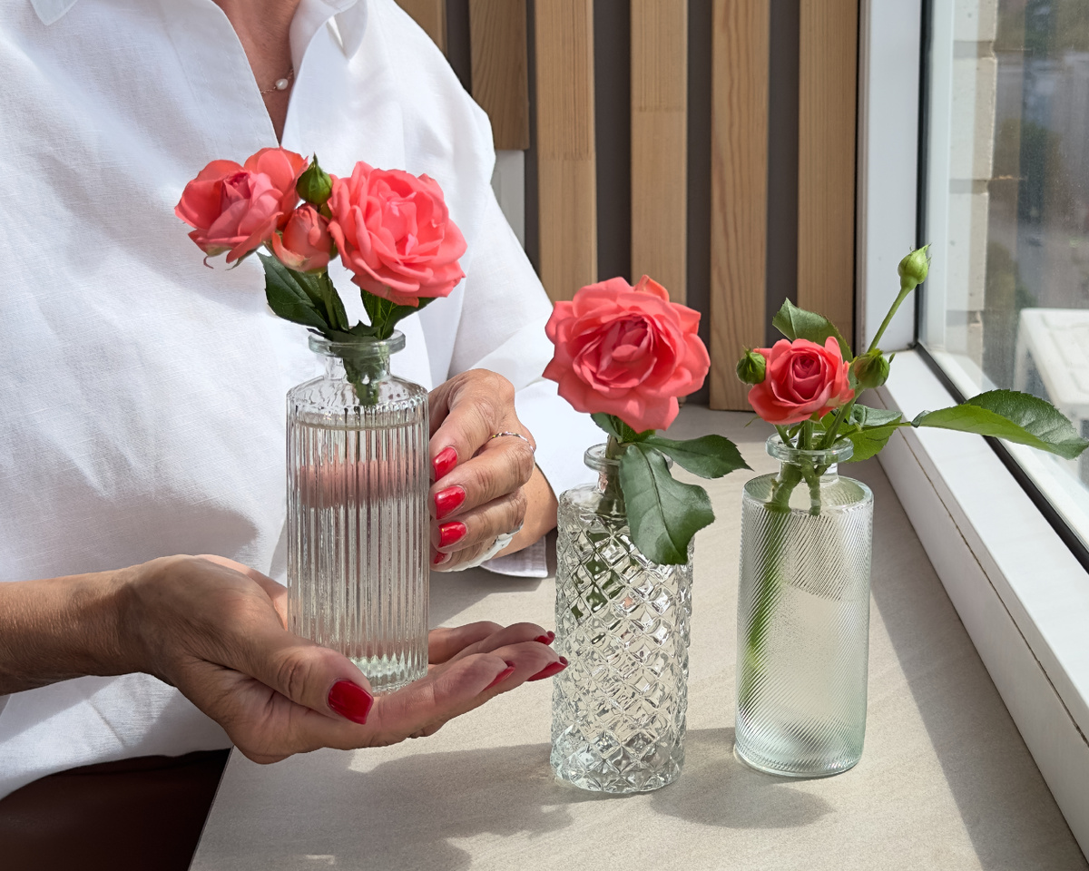 - Максимум стиля при минимуме места. Их главный секрет — в идеальном размере и лаконичной форме. Граненое стекло красиво преломляет свет и играет бликами на свету. Вазочки выглядят дорого и нарядно, не перегружая пространство.