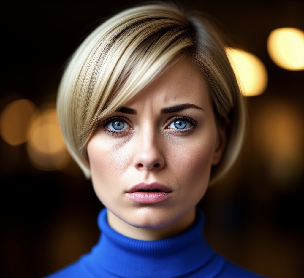 Портрет элегантной женщины средних лет, 25 лет, короткая темная стрижка боб, серьёзное обеспокоенное выражение лица, зеленеющая водолазка, драматическое освещение, размытый фон, кинематографический стиль, высокое качество, фотореализм