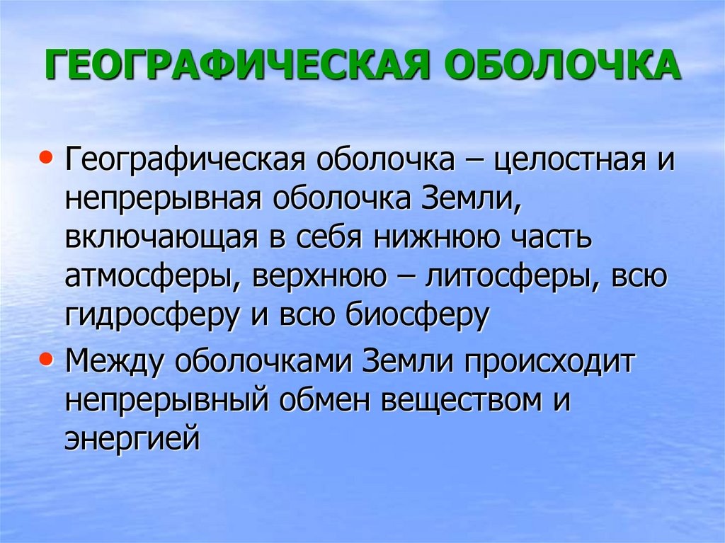 Географическая оболочка – это единое целое. Все ее компоненты постоянно взаимодействуют друг с другом. Реки (гидросфера) вырезают долины в горных породах (литосфера).