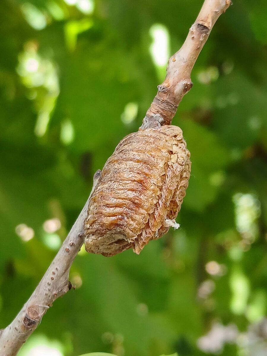При должной наблюдательности на ветках деревьев можно найти оотеки (коконы) богомола