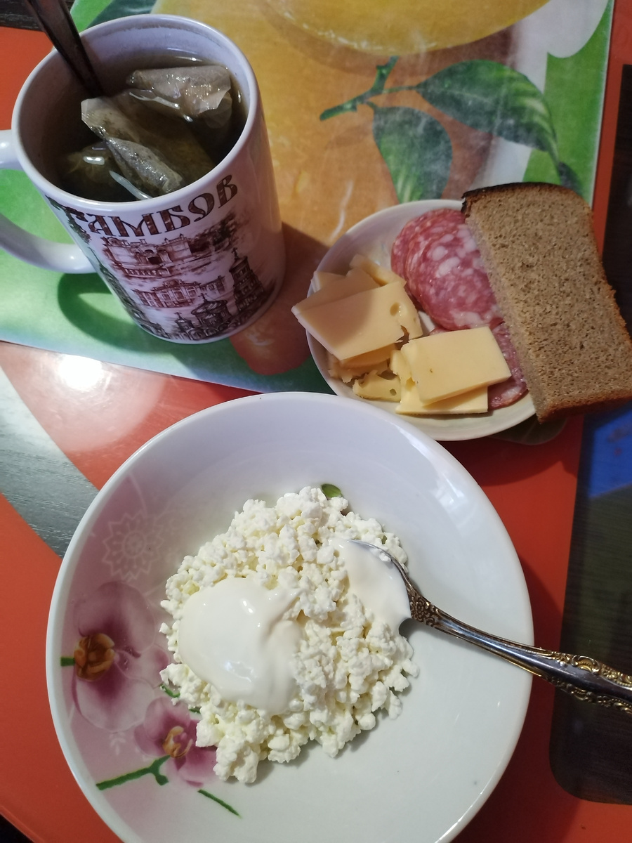 Вместо завтрака я иногда выпиваю стаканчик воды с лимоном. Если за окном холод и ветер, то кружку зеленого чая с мятой и лимоном. Но по выходным у нас совместный завтрак, и его готовит партнер. Спускаюсь к столу: Размер порции определяет супруг. 🤣🤣🤣 Особенно трогательно выглядит пайка хлеба. 😘 Улыбаюсь и ем. Но не все. Хлеб возвращаю в хлебницу. Из 4 ломтиков колбасы беру только два. Остальное-одобрено. Почему так? Скоро расскажу! А что у вас на завтрак?