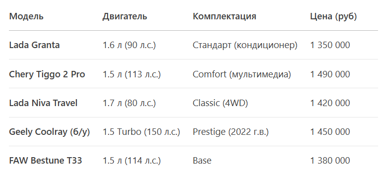 Рынок бюджетных авто сильно изменился: цены выросли, а выбор сократился. Но мы нашли 5 вариантов, которые всё ещё укладываются в 1.5 млн рублей. Сравниваем российские и китайские модели, чтобы вы поняли, за что платите. ✅ Плюсы: ✅ Плюсы: ✅ Плюсы: ✅ Плюсы: ✅ Плюсы: 🔔 Подписывайтесь на канал, чтобы не пропустить: 💬 А вы что выбрали бы? Делитесь в комментариях! Цены актуальны на февраль 2025 года.