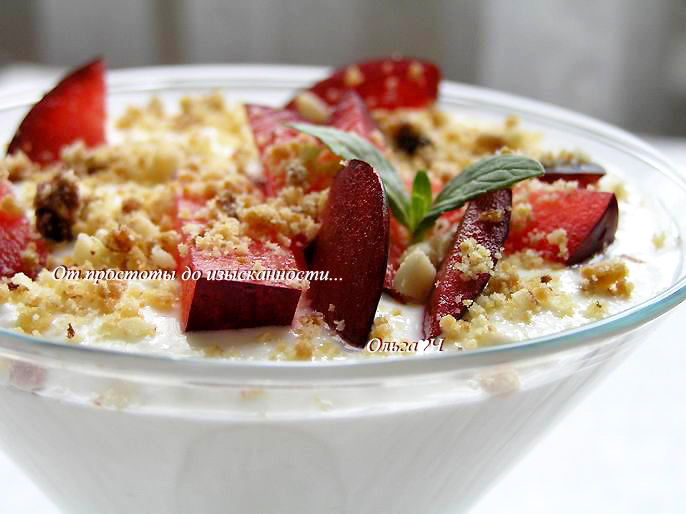 1-2 сливы Приготовление: Творог смешайте со сметаной и сахаром. Печенье измельчите с помощью ножа, выложите в креманку (часть оставьте для посыпки). Добавьте творожный крем. Добавьте нарезанную сливу, посыпьте измельченным печеньем, украсьте мятой. Приятного аппетита! Вам также могут понравиться: