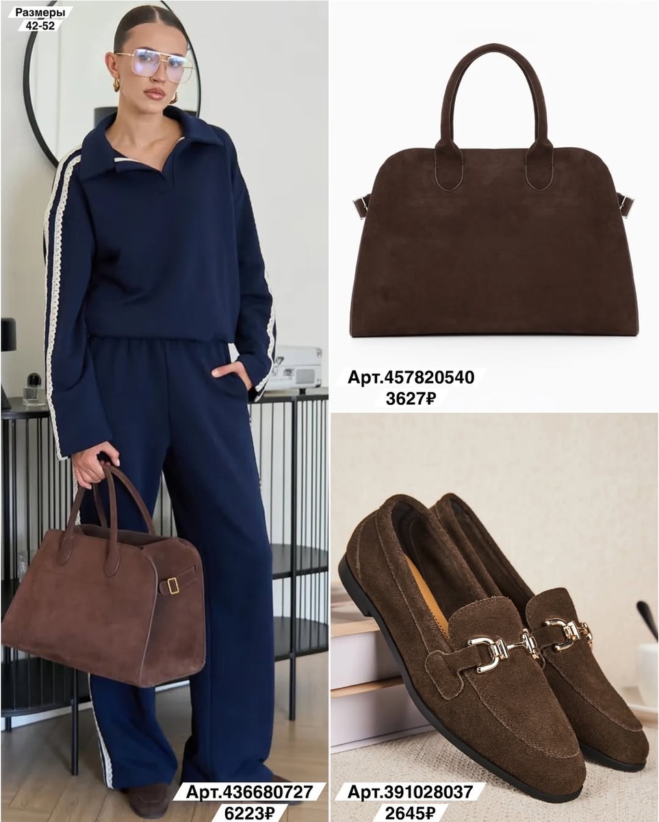 - Монохром «шоколад»: брюки 444706259 + сапоги 490485971 + любая из сумок 436680727/457820540.