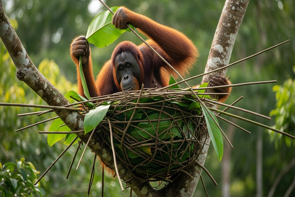 Гнезда у древесных человекообразных обезьян — это не просто место для сна. Они защищают от хищников, сохраняют тепло, обеспечивают безопасность на высоте и даже помогают отпугивать насекомых. У орангутанов есть два типа гнезд: дневные, которые проще, и ночные, представляющие собой сложные платформы, построенные на высоте до 20 метров. В них есть «подушки», «одеяла» и крыши для защиты от дождя.