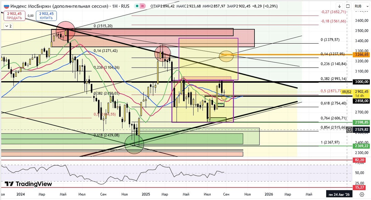🏦 #Индекс_ММВБ ТФ 1Н На недельном графике, картинка "пошире" и даёт чуть больше информации. Здесь видим другой флэт, более глобальный. С конца марта индекс "ходит" от 2600 до 3000. По уму, в таких ситуациях, вариантов поведения несколько: 1. Сидеть с набранными позициями 2. Сидеть без позиций 3. Спекулировать внутри диапазона. Кто и как действует, зависит от его торговой стратегии. Смысл сводится к тому, что нужно ждать выхода из этого диапазона в ту или иную стороны. Это если смотреть широко. Локально: - цена находится в верхней половине боковика - выше "скользяшек" Аллигатора - два явных импульса роста с небольшими техническими коррекциями в 0,618 по фибо в первый раз и в 0,5 во второй. - разворотный "дожик" - цена протестировала уровень 2858 и благополучно закрепилась выше него. А это, как никак, точка перелома локального нисходящего тренда. Всё вышесказанное за рост. Есть ли вероятность пойти ниже? Да, конечно, есть. Но, менее 50% (с моей точки зрения). Но даже в таком случае