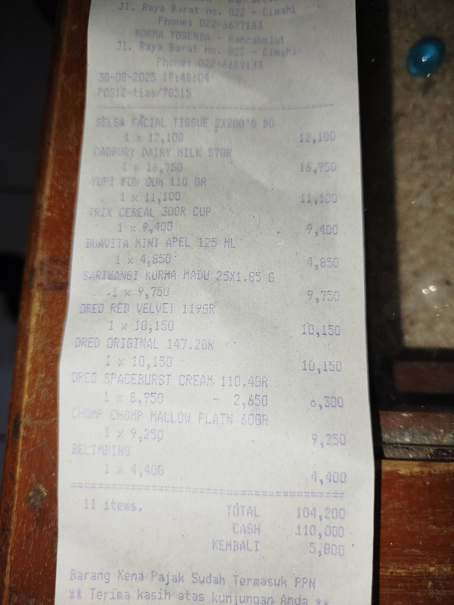 Приехали мы в субботу из городского управления, и я вспомнила, что велосипед не заряжала. А Амира хочет купить в "Борме" печенье "Орео". Я ей говорю - давай завтра съездим, когда велик зарядим, вдруг сейчас сядет по дороге? А она - ну, ничего, ты педали покрутишь! Поехали, в общем. Телефон у меня разрядился, поэтому оставила его заряжаться дома и не сфоткала универмаг изнутри. Но сфоткала, когда вернулись, что мы купили. Получилось на 104200 рупий (502 рубля с копейками), то есть, у Амиры осталось ещё 38300 рупий. Три пачки Орео вышли очень дëшево: большая пачка за 50 рублей, красный бархат по такой же цене и космическое Орео с большой скидкой - 32,5 рубля. И, наконец, купили чай с финиками и мëдом - из "Буаны" он пропал уже давно, а в Борме стоит 50 рублей. Ещё купили салфетки (они там дешевле, чем в Буане аж на 10 рублей) - 60 рублей за две упаковки по 200 штук. Шоколадку "Кэдбери" за 85 рублей, яблочный сок за 25, маршмеллоу за 45, один белимбин за 22 рубля И Амира взяла свои