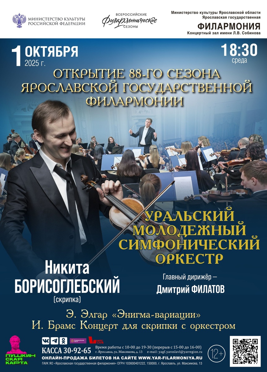 В Международный день музыки, 1 октября 2025 года, в концертном зале Ярославской государственной филармонии состоится торжественное открытие 88-го концертного сезона. 🌐 https://clck.ru/3MEF3j Концерт проводится в рамках программы Министерства культуры Российской Федерации «Всероссийские филармонические сезоны» и станет важным событием в культурной жизни региона. Открытие сезона ознаменуется выступлением одного из ведущих молодых коллективов страны – 👏👏👏Уральского молодёжного симфонического оркестра под управлением главного дирижёра коллектива 👏👏👏Дмитрия Филатова. 🎻Солист – заслуженный артист России Никита Борисоглебский (скрипка, Москва) — лауреат крупнейших международных конкурсов, чьё исполнительское мастерство признано как отечественными, так и зарубежными музыкальными сообществами. 📍Уральский молодёжный симфонический оркестр (УМСО) создан в 2006 году как концертирующий коллектив и академия оркестрового мастерства. Его участники – молодые музыканты, многие из которых впослед