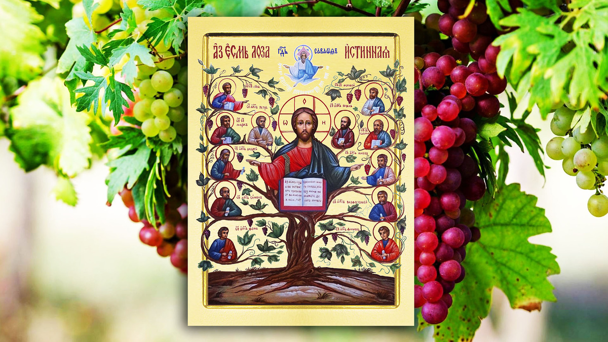 У иудеев, Бога называли «тружеником земли» и «виноградарем», возделывающим весь Израиль как один виноградник. Вообще, виноград это важный символ и несет в себе большое значение. Виноградная лоза и виноградарство неоднократно упоминаются и в Новом Завете. На последней встрече Иисуса Христа с учениками – Тайная вечеря – хлеб и вино были благословлены Спасителем и поданы апостолам со словами: «Сие есть Тело Мое» и «Сия есть Кровь Моя» (Матфей 26, 26-28). Таким образом, было установлено одно из важных христианских таинств – Евхаристия, таинство причастия. Причастившись, христиане соединяются с бессмертным Богом и спасают свои души. СМЫСЛ Этот образ, редкий иконографический тип, изображающий Христа в соответствии с евангельской притчей: Я есмь истинная виноградная лоза, а Отец Мой – виноградарь. Всякую у Меня ветвь, не приносящую плода, Он отсекает; и всякую, приносящую плод, очищает, чтобы более принесла плода. Вы уже очищены через слово, которое Я проповедал вам. Пребудьте во Мне, и