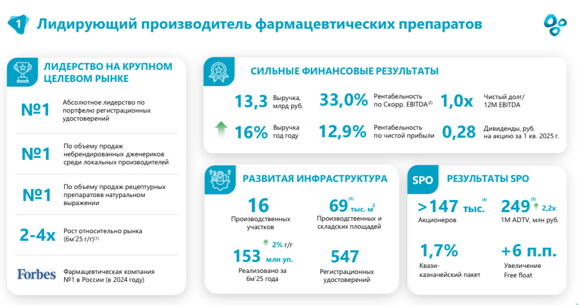 Если смотреть на результаты за всё полугодие, то выручка выросла ощутимо. Добиться этого удалось за счёт расширения ассортимента, активного участия в госзакупках и роста представленности в аптеках. Тренд на замещение импортных лекарств и стремление потребителей экономить играет на руку компании