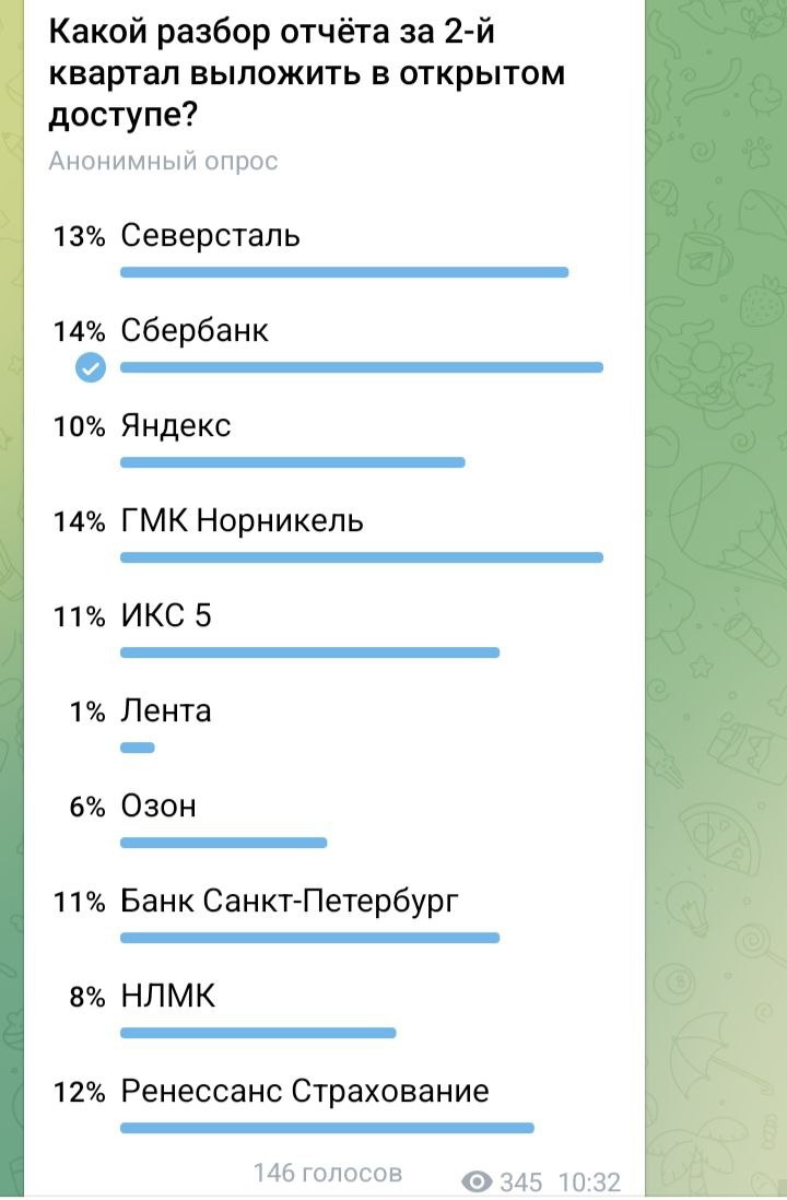 За прошедшие сутки опрос не выявил единоличного лидера ваших предпочтений. В напряженной борьбе ГМК Норникель и Сбербанк набрали по 14%. Благодарю всех участников за активное участие в голосовании! Наш канал от интерактивности только выигрывает. Волюнтаристским решением открываю бесплатный доступ к двум разборам: 1. Доброе слово и кошке приятно. ГМК Норильский никель. Отчет МСФО за 1 полугодие 2025 г. 2. Тоска зелёная. Сбербанк. Отчет МСФО за 1 полугодие 2025 г. В качестве бонуса также открыл публичный доступ ко всем предыдущим разборам этих компаний. Приятного и полезного чтения! Полный каталог статей "Инвестпрактики" находится на моем сайте. Не является индивидуальной инвестиционной рекомендацией. #инвестпрактика #фундаментальныйанализ #GMKN #SBER #SBERP 📱 Александр Доржиев