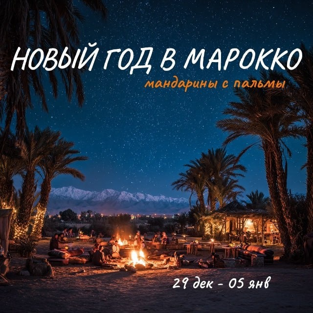 А что, если на Новый год... в Марокко? Когда надоели традиционные оливье и хлопушки, а душа просит настоящего чуда. Чтобы вместо ёлки наряжали пальмы, а за окном шумел не город, а Атлантический океан. Чтобы аромат мандаринов и эвкалипта смешивался с запахом праздника и свободы. Чтобы в новогоднюю ночь танцевать не под бой курантов, а под ритмы берберских барабанов у костра в пустыне. А утро первого января встретить не на диване, а в пути по горным тропам, где в эвкалиптовых лесах резвятся забавные макаки-маготы. В этом году — никаких «может быть»! Только 9-14 новых друзей, солнце, океан, горы и самое незабываемое празднование Нового года в вашей жизни! Решено! Едем в Марокко! 🐪 Даты: 29 декабря - 5 января (как раз успеваем захватить волшебную новогоднюю ночь!). P.S. Уже есть планы на НГ ночь? Тогда погнали в Карелию на январские праздники и Рождество 04-07 января 2026 Кто с нами? Пишите - расскажу подробно! Мест остаётся совсем немного — самое время решиться на приключение!