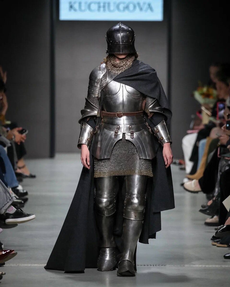 Коллекция бренда KUCHUGOVA (Москва) на подиуме Московской недели моды Бренд представил коллекцию, в которой были переосмыслены темы готики, культа рыцарства и образа прекрасной дамы. Команда исследовала трансформации исторического кроя, сохранив узнаваемые черты эпохи в современном прочтении. Элегантные силуэты выполнены из таких материалов как кашемир, шёлк и дополнены органзой и кружевом. В коллекции использована чёрно-белая гамма, сложные серые оттенки, а также принт «горох». Головные уборы и обувь, разработанные специально для этой линейки, стали её органичным продолжением.