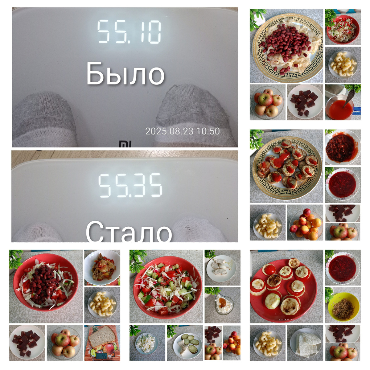 За прошедшую неделю вес увеличился на 250 г. Радует, что колебания веса происходят около 55 кг. На неделе даже видела цифру 54,95