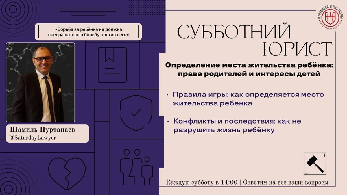 🔴🔴🔴🔴🔴 Определение места жительства ребёнка: права родителей и интересы детей Сегодня 30 августа в 14:00 вы узнаете ответ на этот и на многие другие вопросы на трансляции "Субботнего Юриста" ⚖️ Эфир проведет юрист с более, чем 20 летней практикой – Шамиль Нуртанаев (нажав на имя вы можете узнать о юристе больше). Тема эфира: «Борьба за детей» 📝 Вот основные вопросы, которые мы обсудим в эфире: 1. Правила игры: как определяется место жительства ребёнка 2. Конфликты и последствия: как не разрушить жизнь ребёнку Также, каждый может задать свой вопрос любым удобным для вас способом, перейдя по ссылке: https://clck.ru/3ByDxh Или же просто напишите вопрос в комментариях к посту Получите юридическую консультацию, не выходя из дома! 🎥 Записи эфиров на нашем Rutube: https://rutube.ru/channel/40148985/ VK Видео: https://vk.com/video/@vk.nurtanaev Дзен: https://clck.ru/3DQGpA ⚡️⚡️⚡️⚡️Трансляция пройдет на платформах: VK Видео и Rutube, по ссылкам ниже👇 ✅ Присоединяйтесь к эфиру с