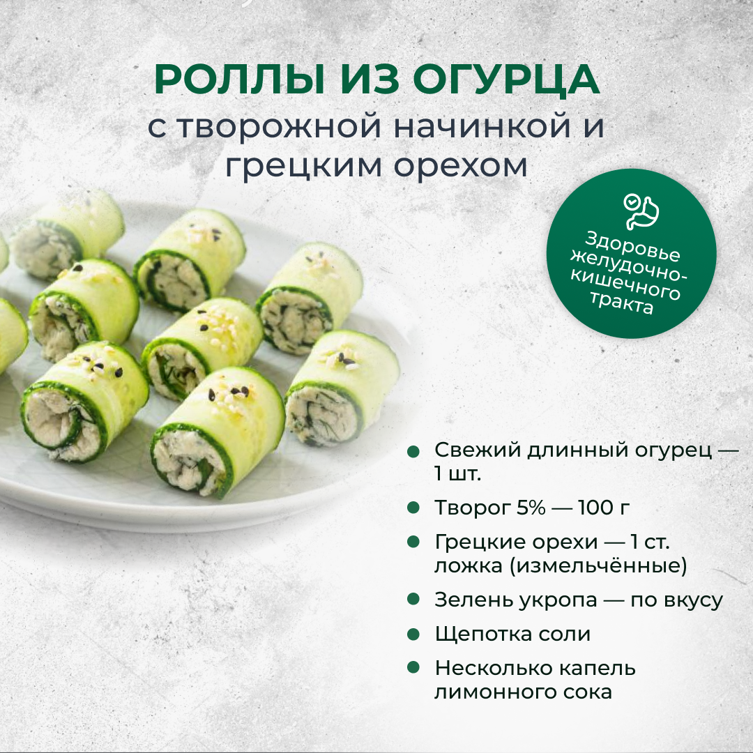 💡 Идеально для тех, кто хочет наладить лёгкое вечернее питание, не перегружать ЖКТ и снизить тягу к сладкому. 🛒 Ингредиенты: 👩🍳 Приготовление: Такие огуречные роллы не только украсят стол, но и помогут снизить нагрузку на печень и поджелудочную. Творог даёт лёгкий белок, орехи — жирные кислоты для мозга, а огурец увлажняет и способствует мягкому дренажу. Отличный вариант для вечернего перекуса или полезной закуски.