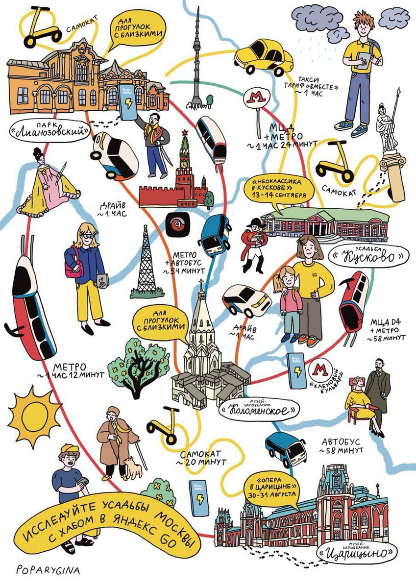 13 и 14 сентября – концерт «Неоклассика» в Кускове Яркие выходные в День города Яндекс Go и проект «Усадьбы Москвы» выпустили карту маршрутов по четырем усадебным паркам Москвы и рассказали историю каждого. Иллюстрации создала художница Полина Парыгина, а маршруты между усадьбами подобраны в разделе Хаб в Яндекс Go. Москвичи и гости столицы смогут найти карту в Кусково, Коломенском, Царицыно и Лианозово: на одной стороне — интересные факты об усадебных парках, на другой — способы добраться до них при помощи Хаба. В этом разделе удобно сравнить маршруты на такси, метро, автобусе, каршеринге и самокате и выбрать самый быстрый, выгодный или комфортный вариант. Ждем вас в Кусково! ❤️
