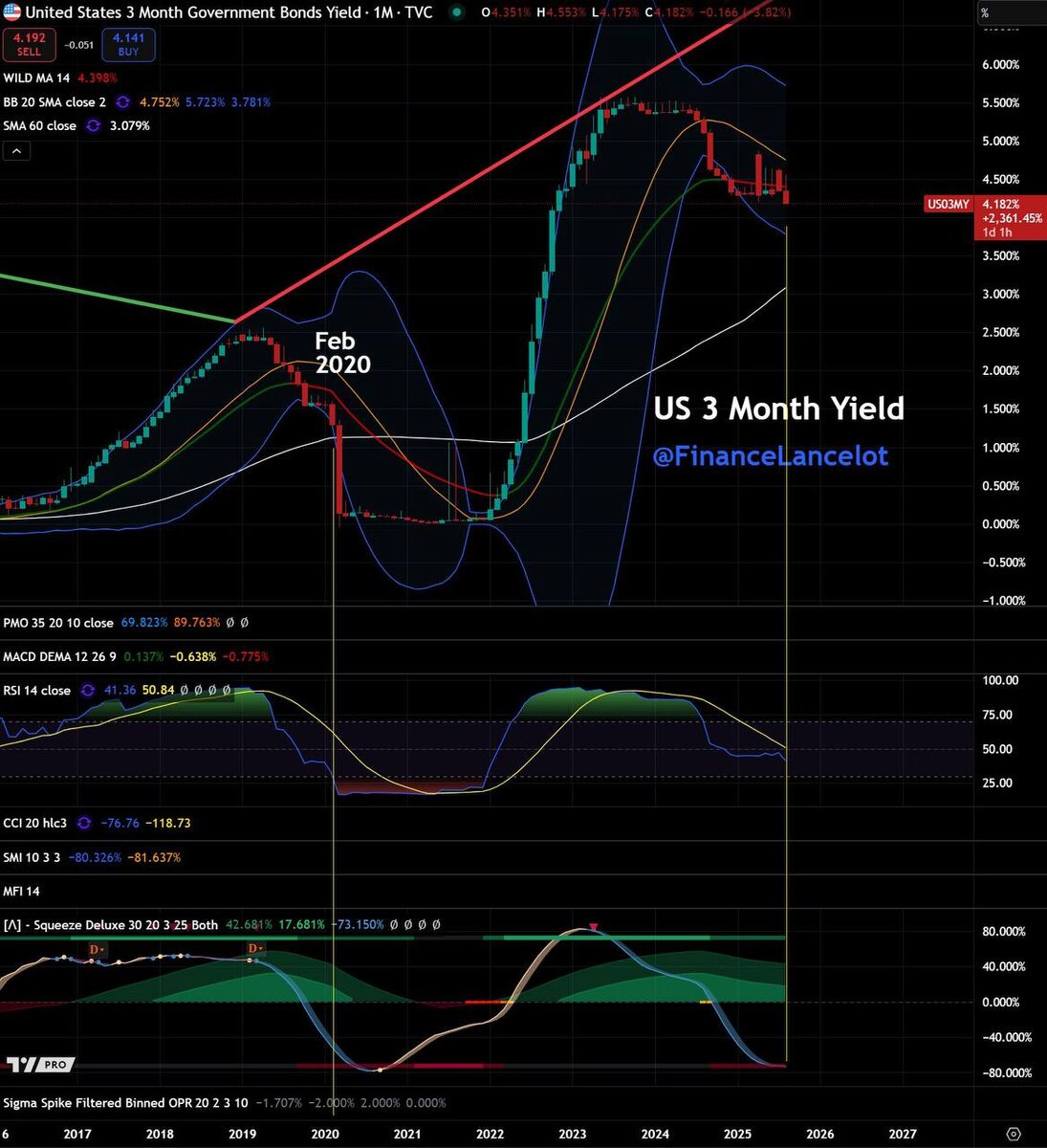 Кривая доходности шепчет о надвигающемся кризисе На графике доходность 3-месячных казначейских облигаций США. Мы видим резкий рост после 2020 года и нынешний разворот вниз. Казалось бы — техническая деталь, но в макроэкономике это сигнал тревоги. 💡 Как работает механика 3M облигаций Трёхмесячные трежерис — это своего рода «наличные с процентом». Их любят за сверхкороткий срок и минимальный риск. Поэтому логика простая: – Если доходность падает → цена растёт → значит, капитал массово уходит в «тихую гавань», переждать бурю. – Если доходность растёт → спрос падает → капитал выходит обратно в риск: акции, недвижимость, корпоративные бонды, иногда и крипта. Ранее мы обсуждали, что именно короткие ставки (3M, 2Y) чутче всего реагируют на политику ФРС. Когда они начинают сползать вниз после экстремального роста — это значит, что рынок больше не верит в долгую «жёсткость» регулятора. Инвесторы ждут смягчения. Но вот нюанс: такие развороты почти всегда приходили не просто так, а на фон