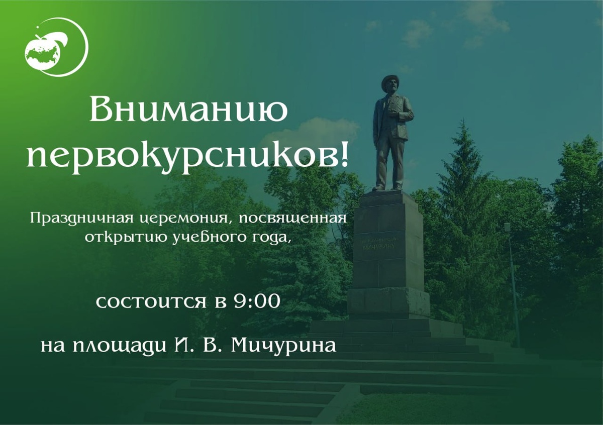 Первокурсник! Торжественное открытие учебного года состоится в 9:00 на площади И.В. Мичурина. ❗️Сбор для студентов разных институтов проходит по следующим адресам и времени: ✅Институт экономики и управления — у корпуса №1 в 8:30 ✅Инженерный институт — в зале «Механизации» 4-го корпуса в 8:20 ✅Институт фундаментальных и прикладных агробиотехнологий — корпус №2, аудитория 25 в 8:00 ✅Социально-педагогический институт — корпус №10, аудитория 18 в 8:00 по адресу Советская 274