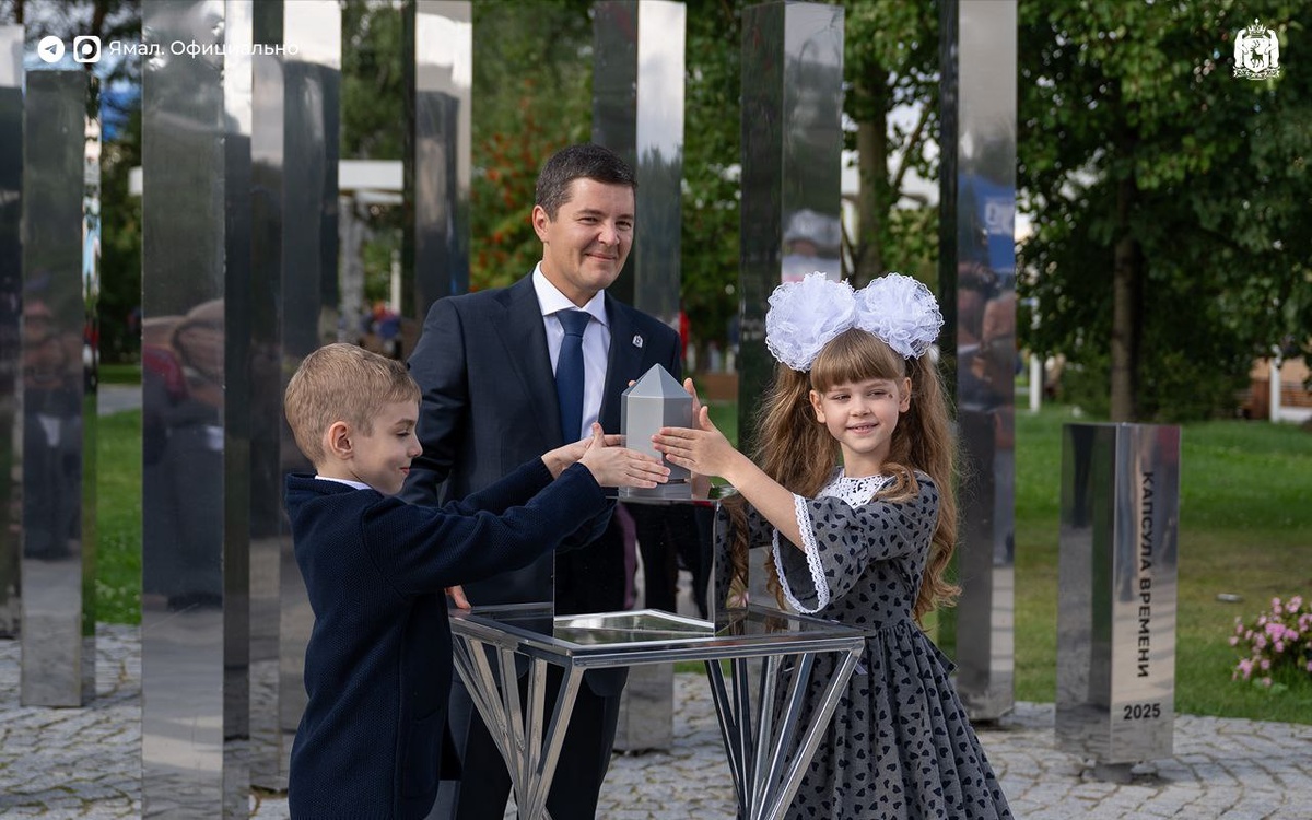 Дмитрий Артюхов в Ноябрьске заложил капсулу времени. Послание ямальцы прочтут в 2075 году, в столетний юбилей города. Компанию губернатору составила молодёжь – отличник учёбы, танцор Даниил Дралюк и внучка ветеранов-первопроходцев Даниэла Джус. #Юбилей_для_людей 🚂🚂🚂🚂 🐻❄️ ЯМАЛ. Официально | Подписаться