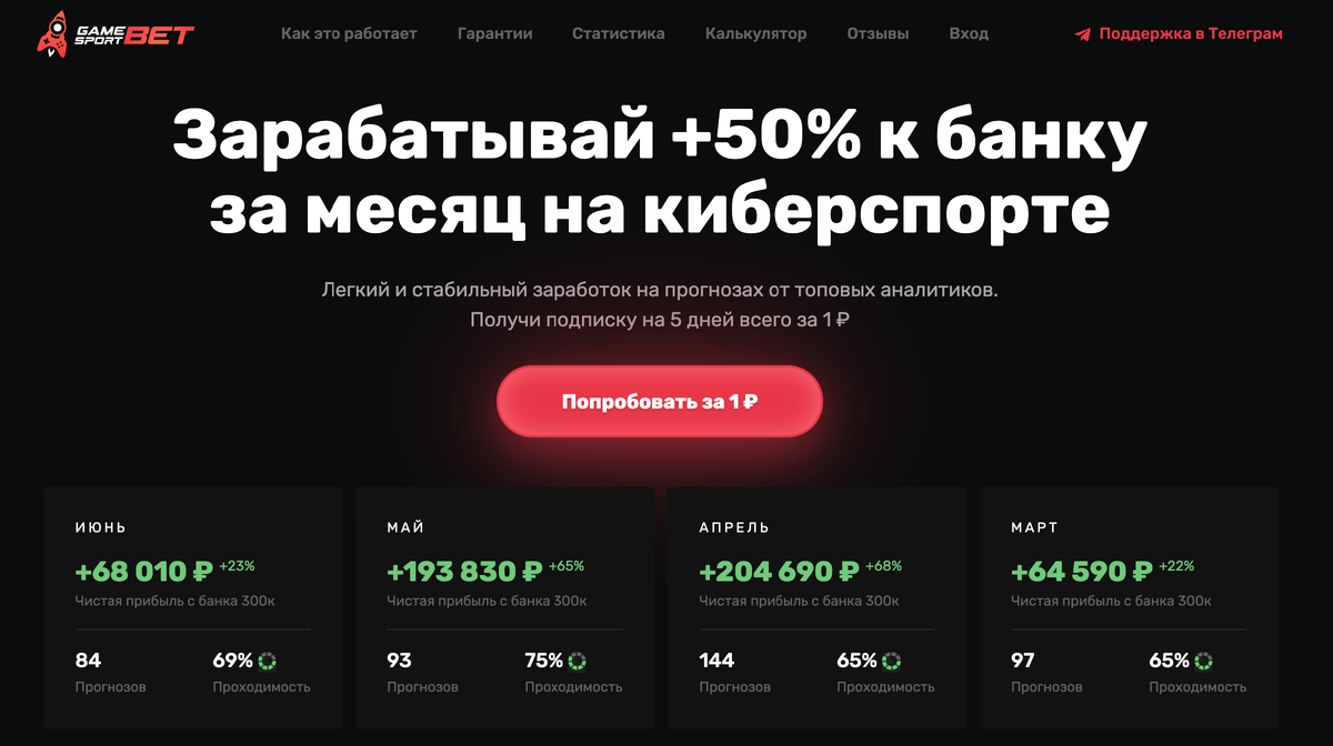 GameSport — букмекерская компания, которая предлагает нам зарабатывать очень хорошие деньги на спортивных событиях. То есть мы будем с вами совершать ставки, после чего зарабатывать. Помимо этого здесь есть обучение. Поэтому вам не стоит бояться того, если у вас нет опыта. С опытной и квалифицированной командой Вы сумеете заработать большие деньги. Вам не нужно усердно и долго работать, наша квалифицированная команда предоставляет прогнозы, благодаря которым Вы ставите ставки и несомненно выигрываете. GameSport — капперский сайт, предлагающий подписку на спортивные прогнозы. Есть подробная статистика за каждый месяц деятельности. Предлагаются платные и бесплатные спортивные прогнозы. Расценки за подписку: «Lite» — 200 рублей «Pro» — 750 рублей
