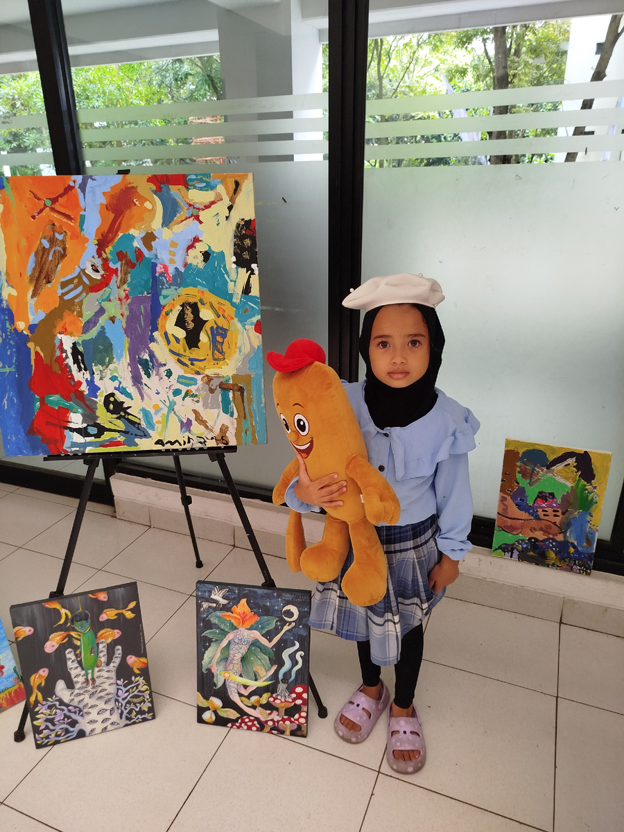 В субботу, 30-го августа, состоялась выставка картин в одном из зданий нашего городского управления. Участвовало довольно много картин и чуть меньше художников. В том числе две картины Амиры Внизу стоят картины большого мальчика - он уже в старшей школе. А вот тут присутсвуют картины мальчика из младшей школы и одна картина девочки, которую я уже показывала Были и профессиональные работы За сколько продали эту - я не спрашивала, но другая картина той же художницы была выставлена за 5 миллионов рупий - тут смешанная техника: камушки, деревяшечки и акрил Мне понравились вот эти розы, не посмотрела, кто автор - внизу мелко написано на бумажке Павлин очень симпатичный тоже Были ещё изделия из дерева И вот такие Вот описание - это целлюлозная пена. Если дословно по-индонезийски - "пена из бумажной каши". Этот же автор делает коробочки из кокосов Несмотря на наличие ремешка, назвать это изделие сумочкой кажется как-то неправильно. Был там и такой макет, но он вне выставки Организаторы (