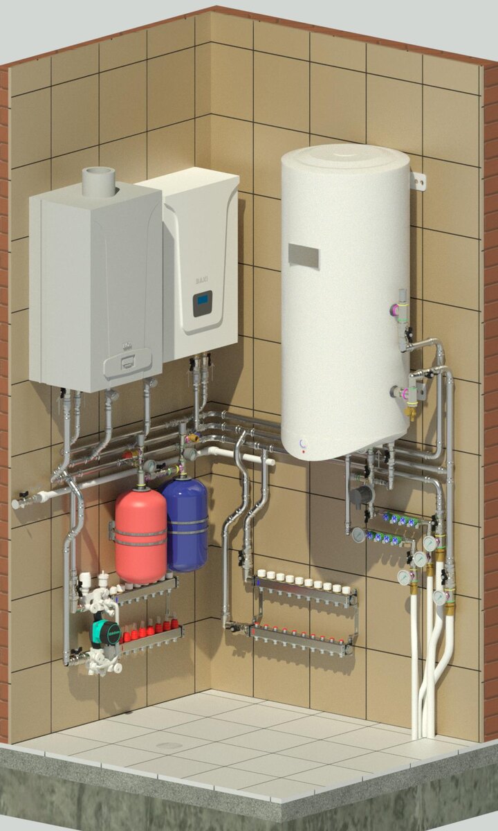 Проект Инженерки_07/25. Котельная с 2-мя котлами и навесным бойлером.