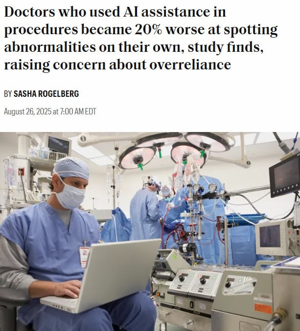 Искусственный интеллект может снижать профессиональную квалификацию врачей. Исследование показало, что всего за несколько месяцев работы с нейросетями медики стали на 20% меньше способны выявлять патологии, когда отключали помощь нейронных сетей. Учёные охарактеризовали такую утрату навыков как «шокирующую» и предостерегли, что внедрять искусственный интеллект в медицину следует с осторожностью. В конце концов, ответственность за лечение должна лежать на враче, а не на системе вроде ChatGPT в белом халате. Наш уютный канальчик 🤖 Анимация | СhatGPT-4 | Помощь с резюме