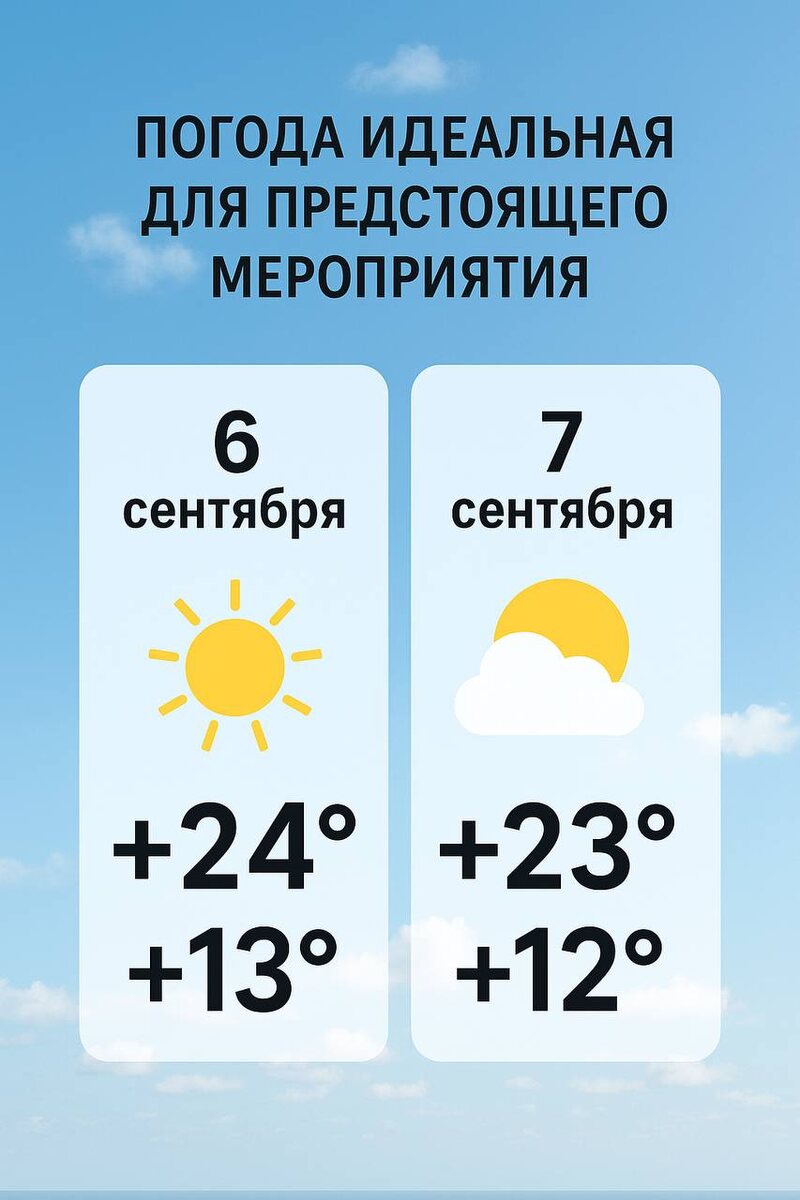 🌿 Друзья, отличные новости! Мы посмотрели прогноз погоды на 6 и 7 сентября в Талдоме, когда будет проходить наше офлайн-мероприятие на ферме 🌾 📅 6 сентября (суббота): ☀️ Переменная облачность, днём около +19 °C, ночью — около +11 °C. 📅 7 сентября (воскресенье): 🌤 Облачно с прояснениями, днём около +20 °C, ночью — около +10 °C. ✨ Погода просто идеальная для предстоящего события: комфортная температура, свежий воздух и никакого дождя. Можно будет в полной мере насладиться атмосферой фермы, поработать, поучиться и отдохнуть в кругу единомышленников. Ждём вас — будет жарко от общения и знаний, а не от солнца 😉 https://ferma-msk.ru/6september