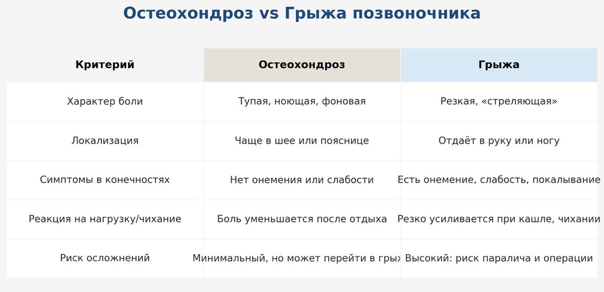 Боль в спине или шее, скованность, дискомфорт при движениях — всё это пациенты часто называют одним словом: «остеохондроз». Но на деле у одних действительно остеохондроз, а у других уже сформировалась грыжа позвоночника.