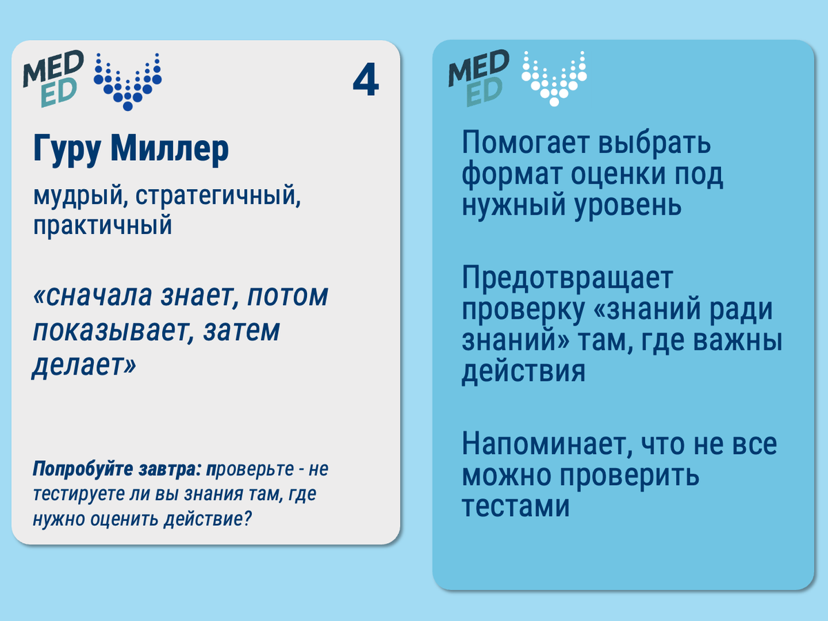 - Для выбора правильных методов оценки – пирамида ясно показывает, что для разных уровней компетентности нужны разные инструменты оценки. Например, тестовые задания не смогут оценить, как студент выполняет процедуру, для этого нужен ОСКЭ или наблюдение на рабочем месте.