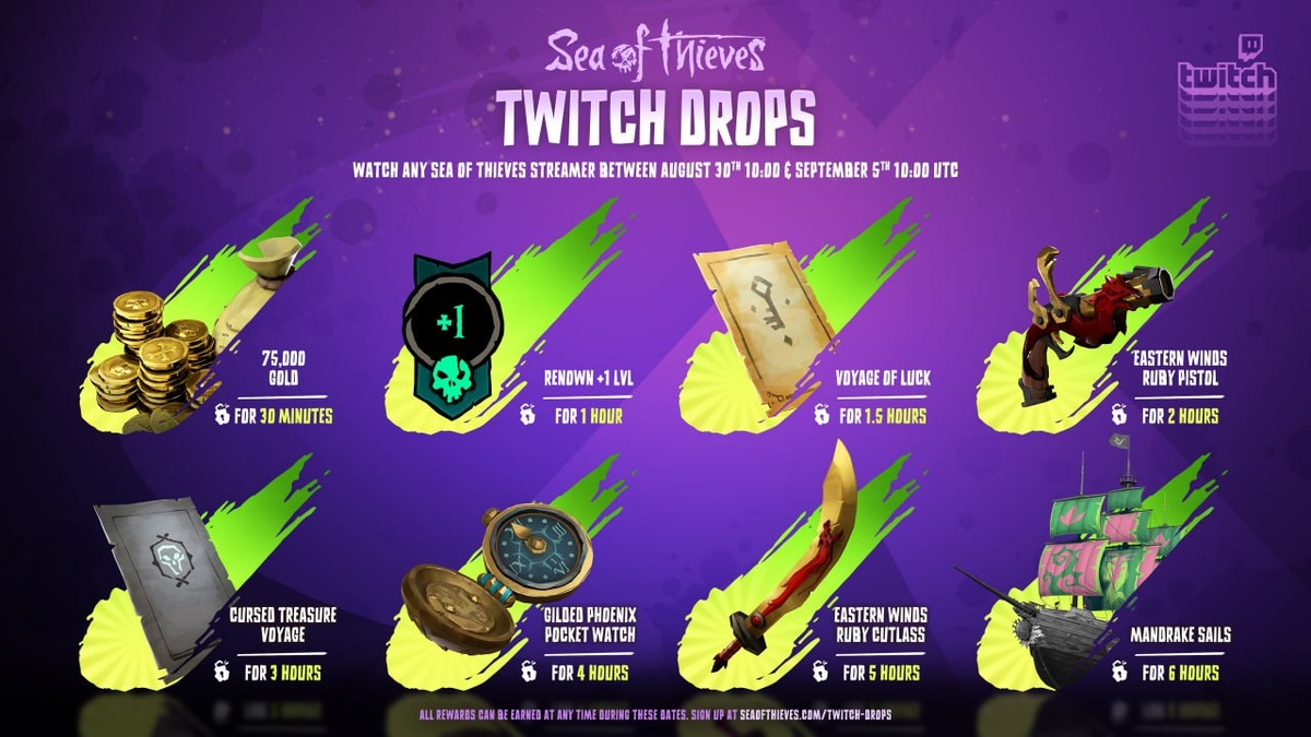 Нужны Twitch Drops прямо сейчас? В рамках этого события доступно восемь наград, включая два косметических рубиновых предмета к 40-летию Rare! Подключайтесь к любой трансляции Sea of Thieves на Twitch где написано (drops), с сегодняшнего дня и до 5 сентября (13:00 МСК) и получите все предметы за шесть часов просмотра. Так же если игроки закроют достаточно мировых событий, то бонусом в дропах появятся обсидиановый стол и журнал.