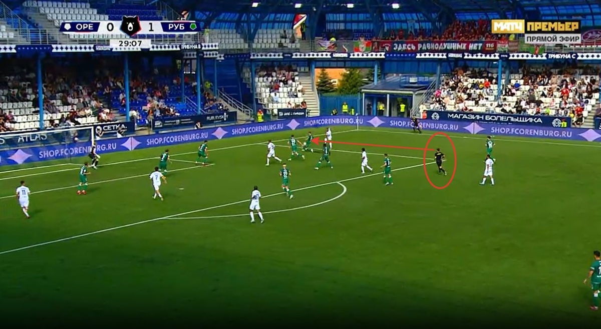 Оренбург-Рубин 30 мин. Находясь в хорошей, открытой позиции. Правильное решение принимает Буланов и продолжает игру после попадания мяча в руку игроку команды Рубин. Игрок команды Рубин, делает движение ногой к мячу что бы заблокировать подачу, мяч попадает в руку которая является естественной при движении футболиста. Правильное решение: Продолжить игру