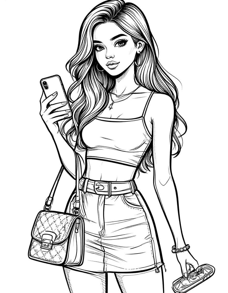 Девушка с телефоном и сумочкой. Раскраска - антистресс. Нейросеть: Шедеврум Студия. #цифроваяживопись #рисунок #нейроарт #цифровоефото #арт #DigitalDreamscapes #нейросеть #нейрофото #digitalart #идеи #артыотнейросетей #aiartwork #шедеврум #иллюстрация #ai #раскраска #антистресс #чернобелое #бесплатныйарт #девушка
