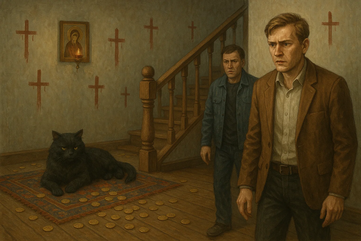 Ладно, делать нечего, решили зайти без него. Входим в прихожую, и тут нас встречает сюрприз: на лестнице, ведущей на второй этаж, развалился огромный чёрный кот с горящими жёлтыми глазами. Он смотрел на нас так, будто мы в его доме незваные гости. А вокруг, по всему ковру, разбросаны монеты — пяти- и десятирублёвые, будто кто-то специально их рассыпал. Картина странная, если не сказать больше. Я сразу набрал Дмитрия:
