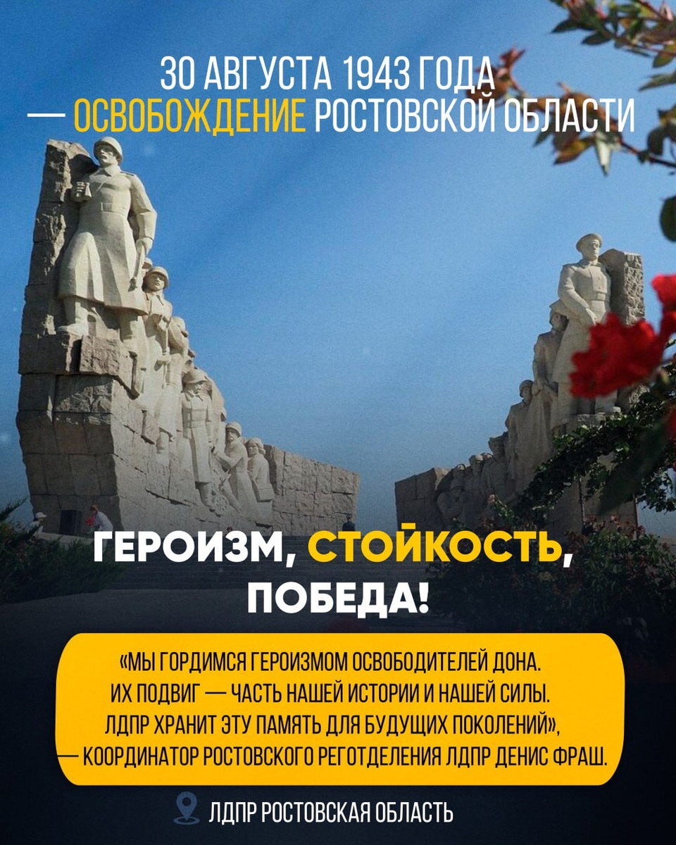 День освобождения Ростовской области от немецко-фашистских захватчиков 🔷 Эта дата навсегда вписана в историю Дона и всей России. 30 августа 1943 года завершилась героическая битва, вернувшая ростовчанам мир и свободу. Тысячи солдат и офицеров ценой своей жизни остановили врага и освободили донскую землю. Сегодня мы чтим их подвиг и склоняем головы перед памятью погибших. Это были простые люди — шахтёры, колхозники, учителя, рабочие заводов, — которые встали на защиту Родины и проявили невероятное мужество. Их героизм — основа нашей истории и пример для будущих поколений. ✨✨✨ помнит, гордится и будет всегда отстаивать правду о войне и победе советского народа. Для нас важно, чтобы молодое поколение знало и ценило подвиг своих предков, а память об освободителях Дона жила в семьях и в сердцах людей. 🇷🇺 Россия — это сила и единство, закалённые в самые тяжёлые времена. И мы обязаны хранить эту память, чтобы никто и никогда не смог её переписать. ❕ ЛДПР: помним, гордимся, защищаем на