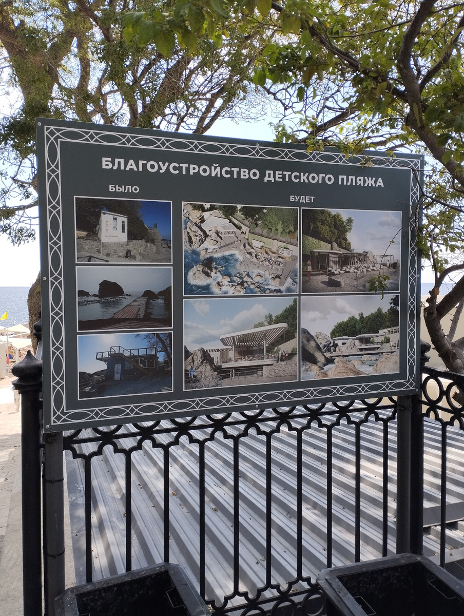 У меня сейчас накопился большой объём информации, включая фото. Судя по трафику, всё это не очень интересно подписчикам моего канала. Но кое-что интересно пользователям Яндекса. Ну, значит, буду продолжать рассказывать, в позже снова вернусь к теме жизни в Донецке, которая, к слову, также непопулярна на данной платформе после очередной реформы. Но это мои проблемы. Читателей они не касаются. Значит, продолжу про реконструкцию Алупки, начавшаяся несколько лет назад и поразившую всех в прошлом году, когда в сети появились фото и видео с улицы Фрунзе. Да, выглядит она совершенно нереальной. Словно декорация к фильму. Но в нынешнем году после реконструкции открылись ещё и пляжи. Покажу свой любимый Детский, который поразил своей живописностью много лет назад. Когда Сбер начал здесь реконструкцию, было страшновато: вдруг всё это исчезнет? Нет, не исчезло. Стало гораздо комфортнее. Вначале информационный стенд у скалы и старой лодочной станции, которая считается исторической. На этом мест