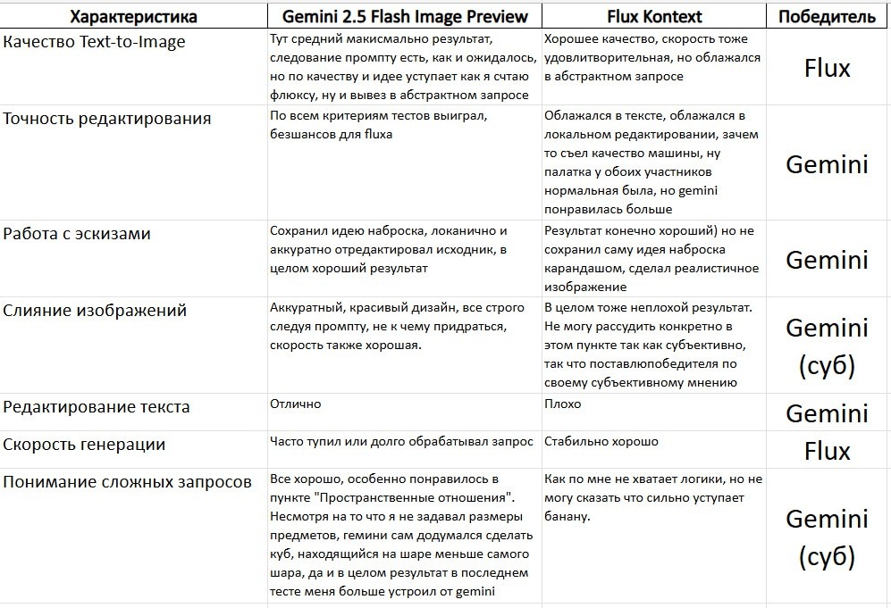 Тест-сравнение: Gemini 2.5 Flash Image Preview против Flux Kontext [pro] Категории тестирования: 🔘Генерация изображений по текстовому описанию (Text-to-Image) 🔘Редактирование изображений и Inpainting 🔘Мультимодальные возможности и работа с несколькими изображениями 🔘Скорость и эффективность 🔘Понимание контекста и следование сложным инструкциям 1️⃣ Генерация изображений по текстовому описанию Цель: Оценить способность моделей создавать высококачественные, релевантныe и детализированные изображения на основе текстовых подсказок. Простой запрос: "Фотореалистичный портрет пожилого библиотекаря в тускло освещенной библиотеке." flux gemini Сложный и детализированный запрос: "Иллюстрация в стиле стимпанк, изображающая кошку-механика, работающую над сложным часовым механизмом в своей мастерской, наполненной шестернями и медными трубами. Освещение должно быть теплым и исходить от увеличительной линзы на ее глазу." flux gemini Абстрактный запрос: "Визуализация концепции 'творческого в