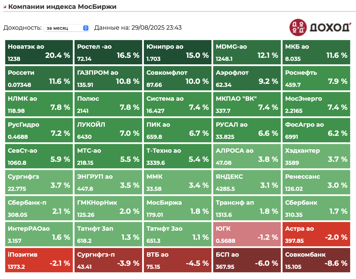 Лидеры роста и падения за месяц по итогам основной торговой сессии.