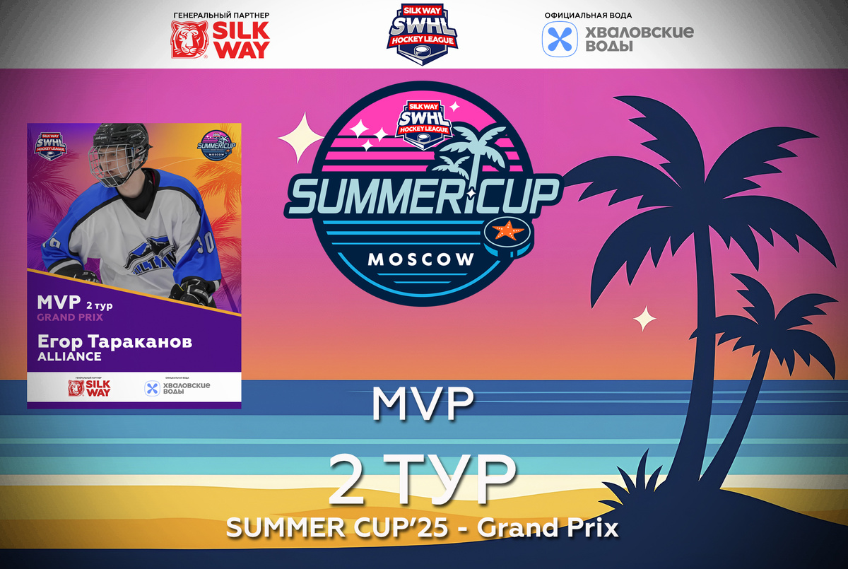 MVP второго тура SUMMER CUP’25 — Grand Prix: Егор Тараканов Silk Way Hockey League продолжает писать летнюю историю SUMMER CUP’25, и второй тур Grand Prix подарил нам нового обладателя звания MVP недели — нападающего команды ALLIANCE Егора Тараканова. ALLIANCE после неудачного старта в первом туре сумели перезагрузиться и выйти на лёд с совершенно иным настроем. Соперником стала Silk Way Star — команда, которая не нуждается в представлении и уже имеет титул чемпионов одного из розыгрышей этой летней серии. Именно в таких матчах рождается настоящий характер. Если взглянуть на итоговый счёт 7:1, может показаться, что матч прошёл без интриги. Однако статистика рассказывает совсем другую историю. • Первый период — равные броски по воротам (11:10 в пользу Silk Way Star). Единственная шайба периода принадлежит Егору Тараканову — именно он открыл счёт на 15-й минуте и подарил команде минимальное, но важное преимущество.