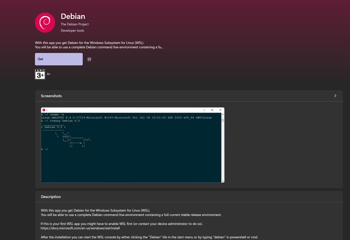 В списке появится информация о системе. Если среди первых строк видите «Debian» или «Ubuntu», значит, всё в порядке. Если же написано Arch или что-то ещё, для этой инструкции проще всего поставить Debian: зайдите в Microsoft Store, найдите Debian, нажмите «Получить» и дождитесь установки.