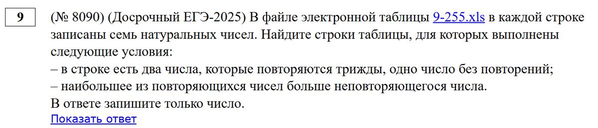 Задача с сайта Полякова К.Ю. Досрочный ЕГЭ-2025 решение стандартное - скачиваем файл открываем правый верхний угол программы - разрешить редактирование видим 7 столбцов с числами теперь по поиску повторяющихся чисел в строке - у нас при выполнении работы будут только две формулы - ЗАПОМНИТЬ! их нужно! отработать (пару-тройку раз решить задания) буду искать пошагово, сколько раз повторяется первое число в строке, потом второе и так далее теперь вносим корректировку в диапазон, чтобы столбцы не менялись перед A и G ставите знак доллара (на клавиатуре английская раскладка цифра 4 + shift) $A и $G наводите на правый нижний угол ячейки, появляется черный крестик - зажимаем левой кнопкой мыши и продлеваем вправо на 7 ячеек (в начальном диапазоне их 7) наводите курсор мыши на правый нижний угол крайней правой ячейки и два раза кликаете левой кнопкой диапазон автоматически продлится до до конца таблицы теперь по условию мы ищем в строке два числа, которые повторяются трижды - это значит шесть