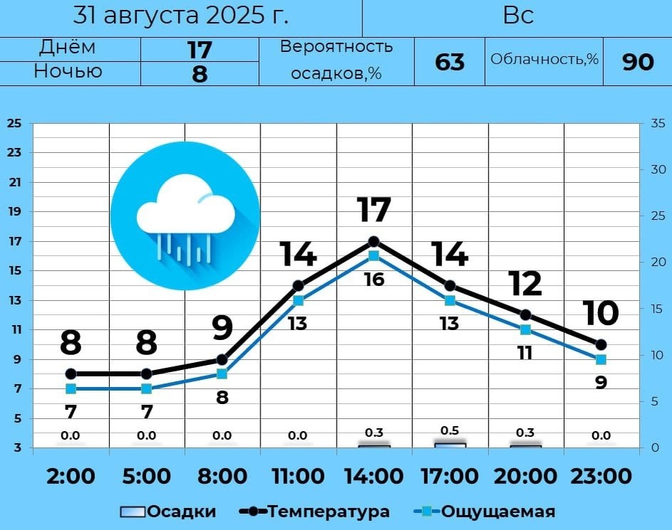 🌡️ Днем воздух прогреется до +17 градусов, а ночью столбик термометра опустится до +8. Это на пару градусов ниже климатической нормы.