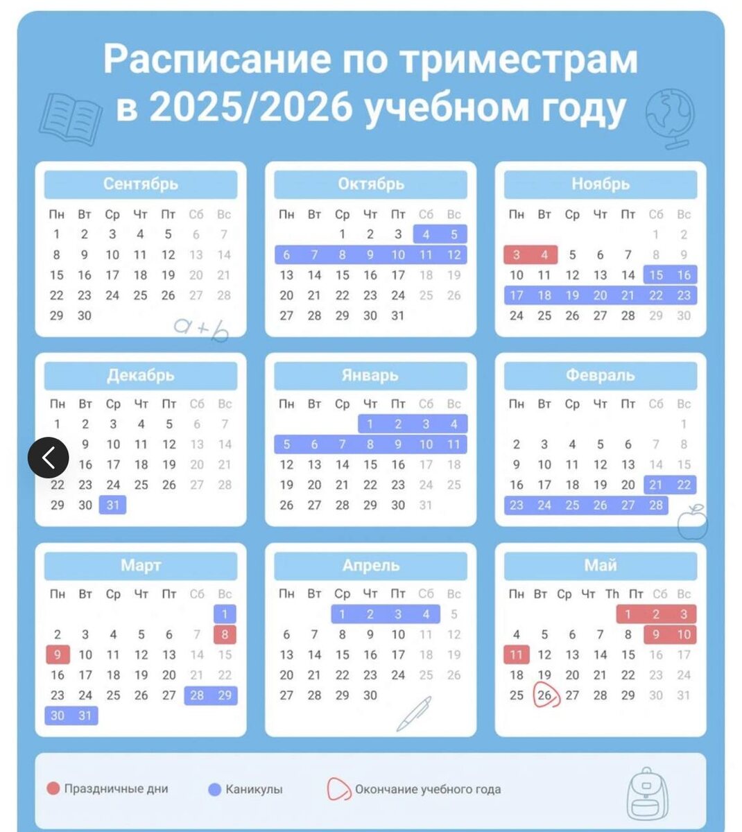 Новый учебный год продлится с 1 сентября 2025 года по 26 мая 2026 года. Школы могут организовать обучение как по четвертям, так и по триместрам.
