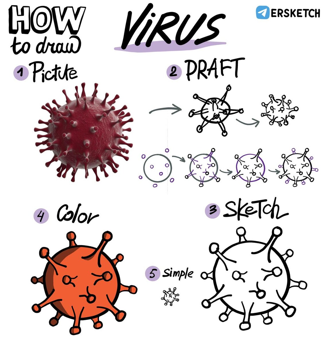 #HowToDraw #WSC2025 №35 Благодаря событиям недавних лет мы теперь все точно знаем, как выглядит вирус. Давайте же его нарисуем. Начнем с воображаемого круга. Ну или круга, нарисованного карандашом, потому что потом придется стирать. Вокруг этого круга нарисуем несколько маленьких кружков и еще несколько внутри. Следующим шагом нужно будет от этих кружков провести ножки, направленные к центру круга. Причем чем дальше от центра круга кружок, тем длиннее ножка. И ножка должна быть у основания шире, чем у макушки. Теперь надо, если у вас круг был нарисован карандашом, стереть линии, которые перекрываются ножками, а если у вас был воображаемый круг - дорисовать линии, которые образуют круг. Теперь осталось еще добавить ножки, расположенные в задней части круга. То есть нужно еще несколько кружков и ножки от них, которые упираются в круг. Ножки вместе образуют вокруг круга такую корону, из-за чего такой вирус называется коронавирусом.