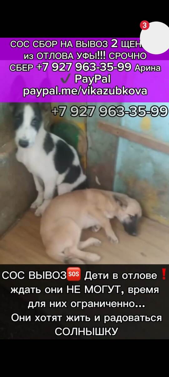 Катастрофа! Срывается ВЫВОЗ ДВУХ ЩЕНКОВ из отлова Башкирии! 1 сентября должна была быть отправка поездом.....пока щенки не умерли нужно срочно отправлять🙏🏻🙏🏻🙏🏻 В Москву билеты, зоотакси и 2 клетки 16.000₽ ⚡️К СБОРУ 16.000 руб ⚡️ Для СПАСЕНИЯ ЖИЗНИ, пожалуйста, помогите! ✔️ карта СБЕР номер: 2202201954225021 к номеру телефона: +79279633599 Арина Константиновна ✍🏼С. пометка: «Уфа, ВЫВОЗ 2» ✔️ PayPal https://www.paypal.me/vikazubkova ✍🏼с ОБЯЗАТЕЛЬНОЙ пометкой "Уфа, ВЫВОЗ 2" ✔️ АНО «Новая жизнь» ИНН 0274393917 КПП 027401001 Р/с 40703810306710000177 Башкирское отделение N8598 ПАО Сбербанк БИК 048073601 К/с 30101810300000000601 Назначение платежа: «Благотворительное пожертвование на уставную деятельность» ‼️ОТЛОВ....Собаки в отлове молят о спасении .. Вы - их последний шанс на жизнь... 🙏🏼они ждут из последних сил! Сжальтесь, заберите.. 🚙 доставят Зооперевозчиком по России . ПОСМОТРИТЕ В ИХ ГЛАЗА.......😢👉🏼https://t.me/katalog_sobak_ufa ПИШИТЕ ИЛИ ЗВОНИТЕ ВОЛОНТ