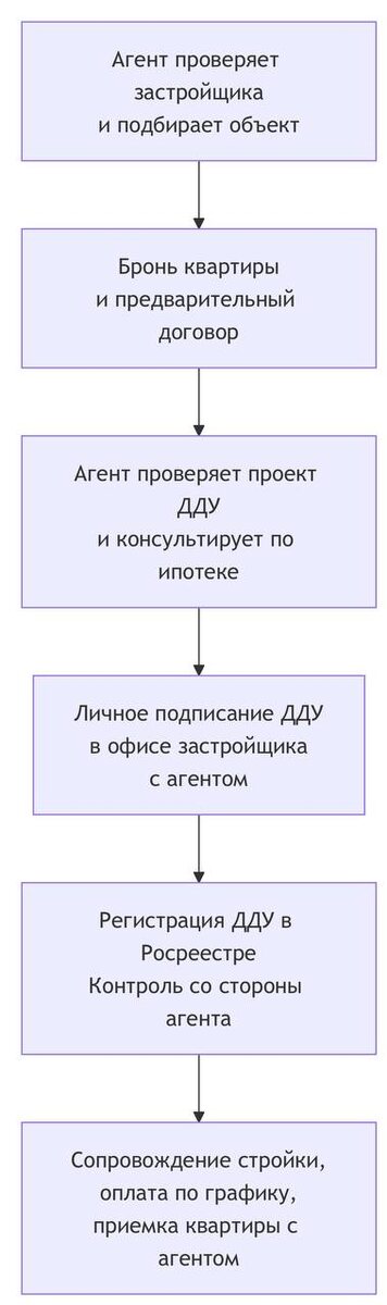 Сегодня я хочу рассказать о роли агента в сделке с ДДУ: Агент не подписывает договор вместо Вас и не является стороной сделки. Его задача — организовать весь процесс, проверить всё за вас и добиться лучших условий. Пошаговый процесс с участием агента: ШАГ 1: Подбор объекта и проверка застройщика (Самое важное!) Что делает агент: Подбирает новостройки под ваш бюджет и запросы. Проверяет застройщика: наличие разрешения на строительство, проектную декларацию, статус в реестре дольщиков. Смотрит историю и репутацию. Сравнивает цены и планировки, договаривается о максимальной скидке. Что делаете вы: Одобряете итоговый вариант. ШАГ 2: Предварительный договор (бронь) Что делает агент: Договаривается с застройщиком о бронировании выбранной квартиры на 3-7 дней (чтобы вас никто не опередил). Получает на руки документ с фиксацией цены и условий — опцион, соглашение о брони и т.д. Что делаете вы: Вносите небольшой задаток, чтобы снять квартиру с продажи. ШАГ 3: Подготовка к сделке Что д