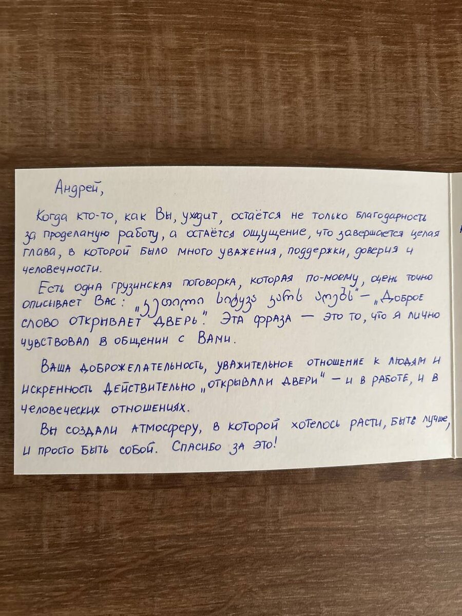Я еще обязательно соберусь с силами и поделюсь с вами последними днями работы и жизни в Тбилиси, которые запомнятся мне на всю жизнь. Но сегодня я получил открытку от своего коллеги, которая меня растрогала. Я хочу этим поделиться. Вчера мы прощались, я пообещал, что открою подарок и прочитаю письмо уже в дороге, в России. Обещание сдержал. До сих пор меня пробивает на эмоции, у меня невольно наворачивается скупая мужская слеза. Мне безумно приятно, я не могу подобрать слова к этому. Люди, которые меня окружали в Грузии, которые были рядом всегда будут со мной и дальше. Знаете, я много думал о конфликте между нашими народами, этого нельзя отрицать, напряжение есть. Но если нам удалось хотя бы на чуточку сблизиться, отбросив все стереотипы, навязанные мнения, политику и прочий бред - мы победили. Мы, обычные люди, которые хотят помогать друг другу, жить мирно своей жизнью, уважать других и быть терпимыми. Спасибо вам, что приняли меня. Я никогда вас не забуду.