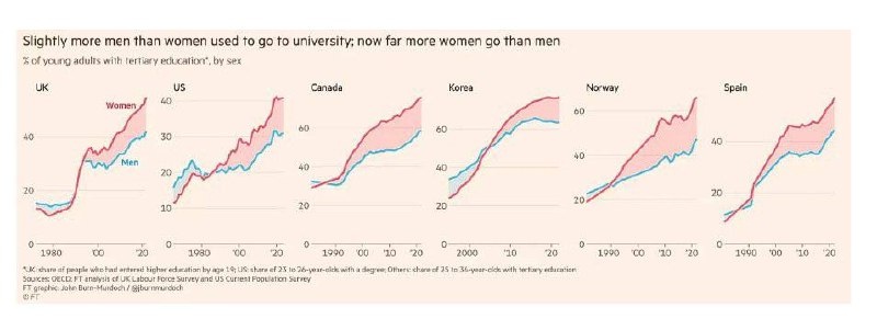 В России, как мы знаем, доля женщин с высшим образованием больше, чем доля таковых у мужчин (и разрыв увеличивается) Но на самом деле это общий тренд для всех развитых (и всё больше – среднеразвитых) стран мира – как мы видим на графике Многие западные демографы, именно в этой причине усматривают резкий спад рождаемости (а также снижение браков и рост разводимости) Причина эта – рост экономической независимости женщин: «Любовь, деньги и уважение - главные причины брака Но два из них теряют свою актуальность Заработная плата молодых женщин приближается к зарплате мужчин (или уже становится выше), а одиночество перестало быть клеймом А потому женщины повышают свои стандарты В экономически развитых и культурно либеральных обществах женщины могут получать достойную зарплату и жить одни, не подвергаясь стигматизации В отсутствие давления, вынуждающего их выходить замуж и рожать детей, желание найти мужа находится на рекордно низком уровне Экономисты обнаружили, что, когда женщины получают